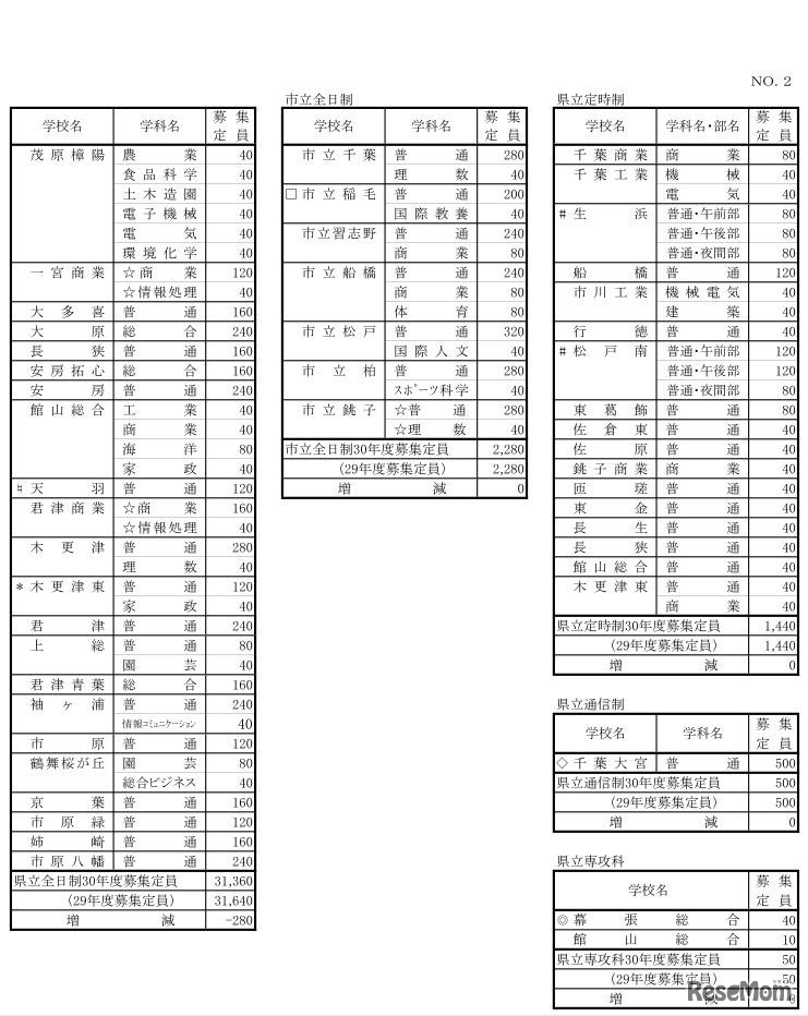 千葉県教育委員会は8月23日、平成30年度(2018年度)千葉県公立高校の第1学年生徒募集定員を発表した。全日制は東金や柏の葉など10校で募集学級を減らし、募集定員は前年度比280人減の3万3,640人とする。