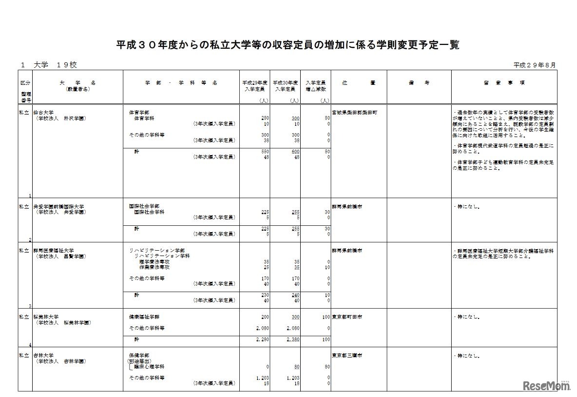 平成30年度からの私立大学等の収容定員の増加にかかる学則変更予定一覧(一部)
