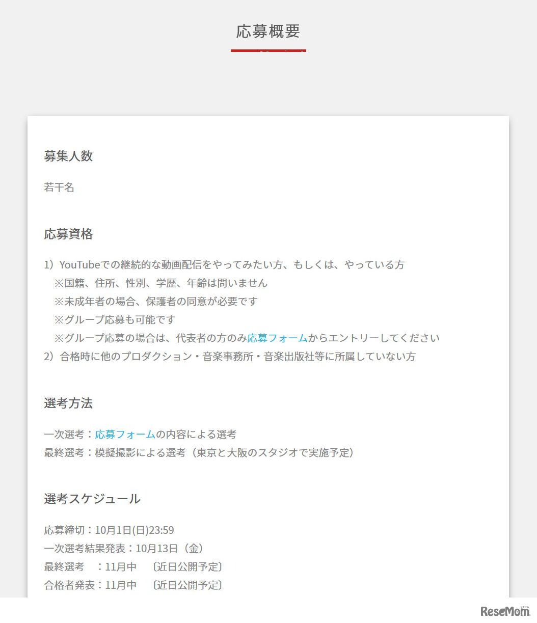 ワオ・エージェンシーは、YouTuber(ユーチューバー)を目指す新しい才能の発掘を目的とする「ゼロからはじめるYouTuberオーディション」を開催する。年齢や性別、国籍や学歴は不問。保護者の同意があれば、未就学児も参加できる。
