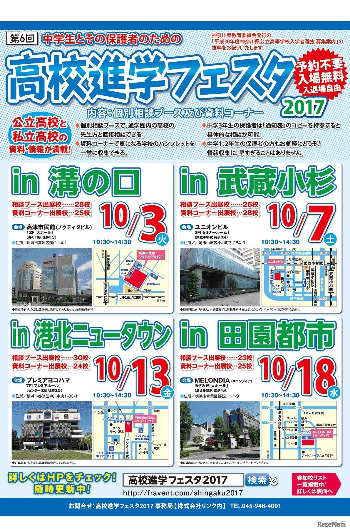 中学生と保護者のための「高校進学フェスタ2017」が、10月3日に溝の口、10月7日に武蔵小杉、10月13日に港北ニュータウン、10月18日に田園都市で開催される。予約不要で入場無料。