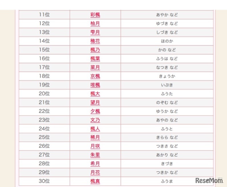 スマートフォン向けアプリ「赤ちゃん名づけ」を提供するリクスタは、2016年9月~2017年8月にアクセス数の多かった「秋にまつわる名前ランキングベスト30」を発表。1位に「和楓(ほのかなど)」、2位「杏月(あつきなど)」、3位「文子(あやこなど)」がランクインした。