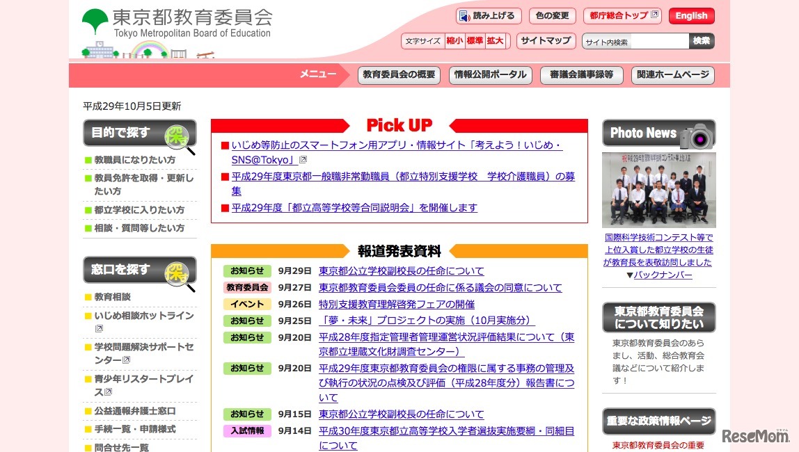 東京都教育委員会は10月3日、平成29年度(2017年度)の公立小中学校教員の公募についてWebサイトに情報を公開した。平成30年(2018年)4月1日付けでの異動が対象。島しょ地区や西多摩地区、コミュニティ・スクールなど7区分で公募を実施する。