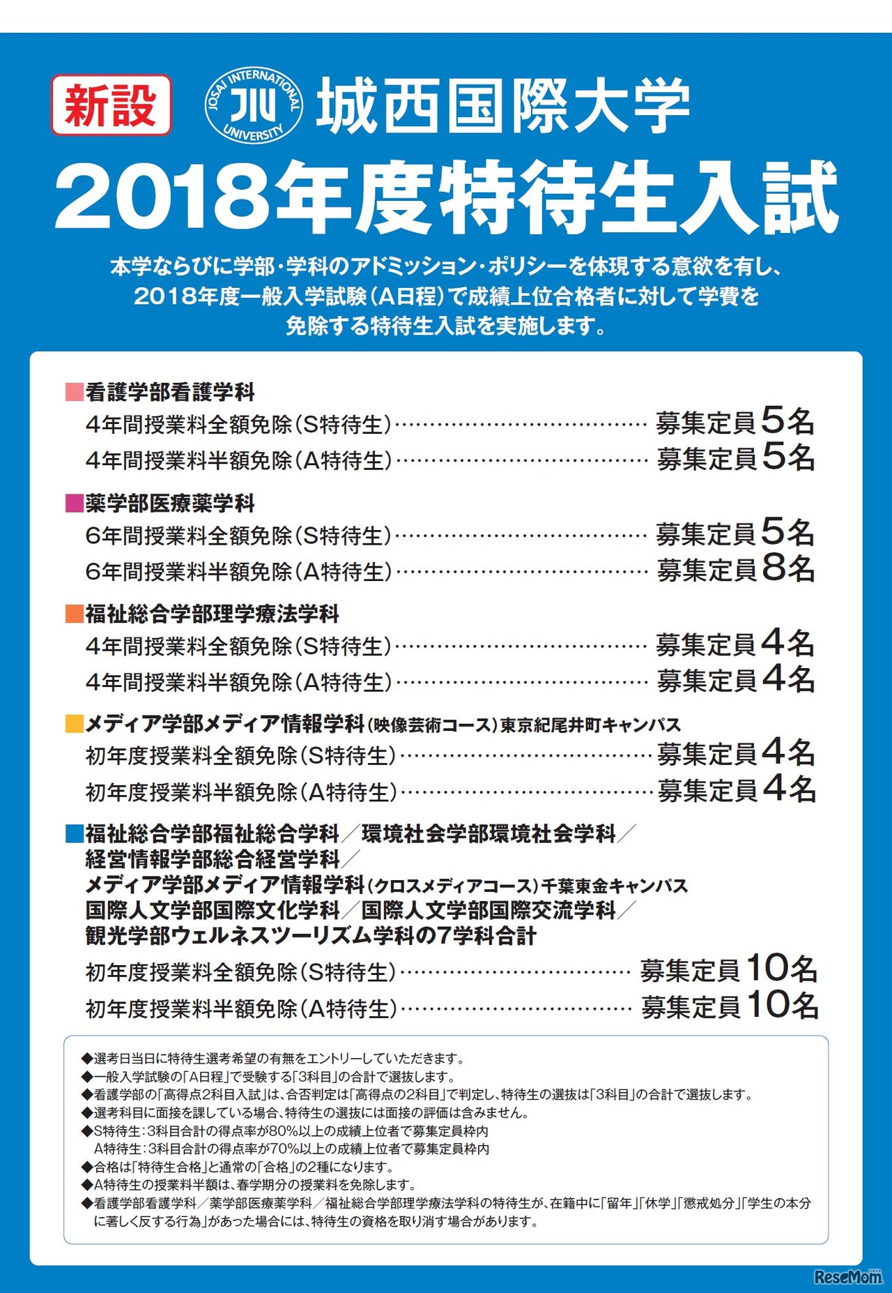 城西国際大学は、2018年1月28日に行われる一般入学試験A日程において、授業料が全額または半額免除となる特待生入試を実施する。全学部が対象となっており、全体で59名が選考される。