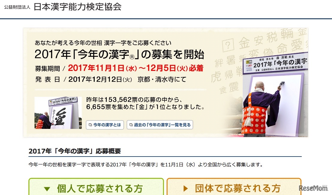 日本漢字能力検定協会は、2017年の世相を表す漢字一字「今年の漢字」を11月1日~12月5日の期間、広く一般から募集する。今回よりスマートフォンからの応募をより簡単にし、応募箱、はがきと合わせて応募を募る。発表は12月12日の「漢字の日」に行う。