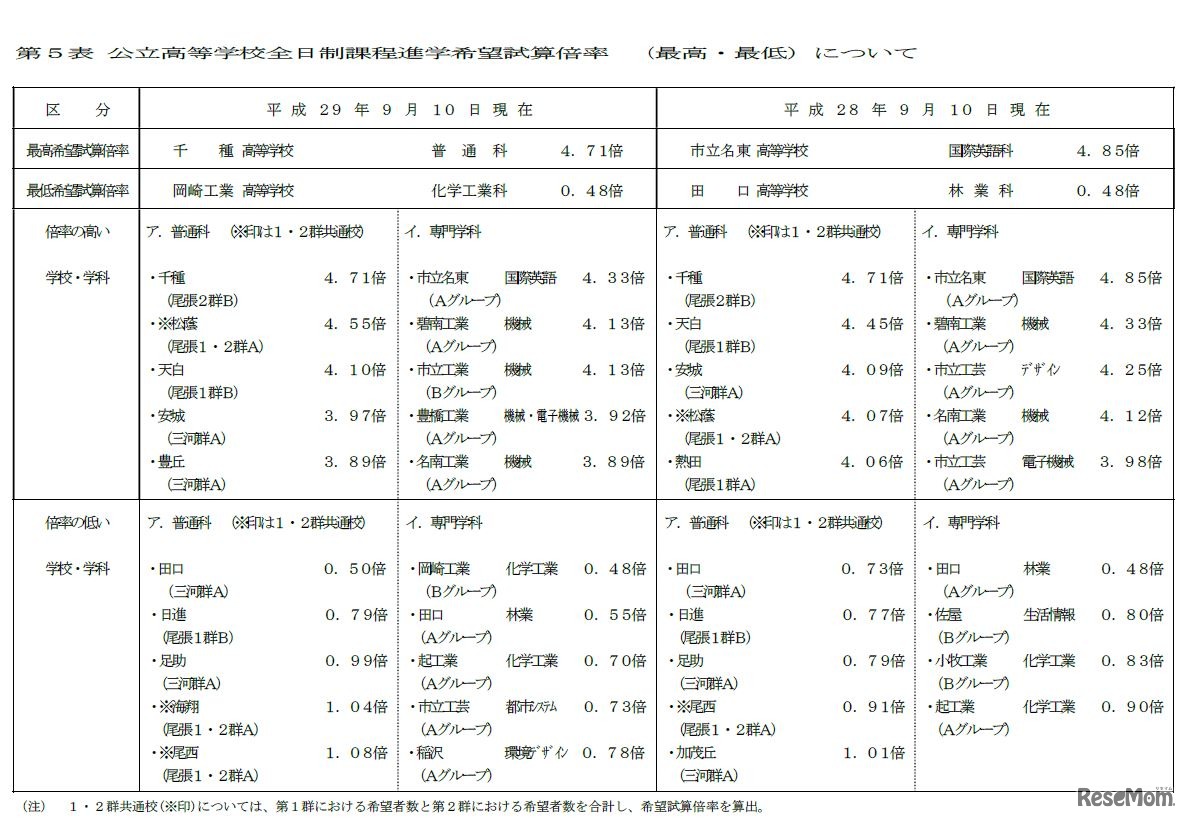 画像:愛知県 平成29年度(2017年度)第1回の「中学校卒業見込者の進路希望状況調査」 公立高校全日制課程進学希望試算倍率 (最高・最低)