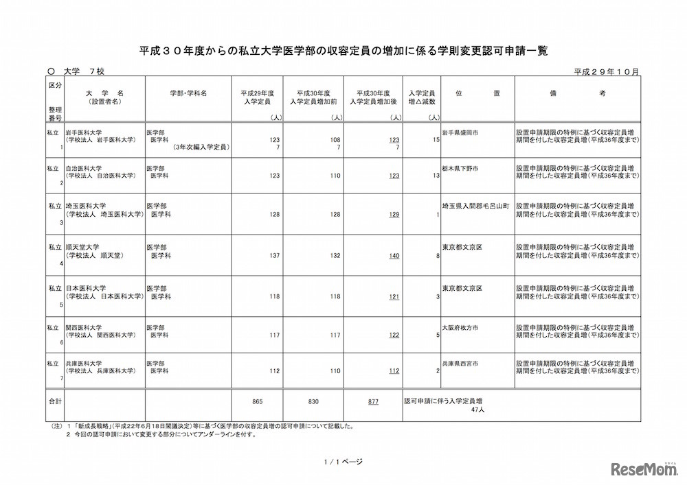 文部科学省は10月16日、平成30年度(2018年度)からの私立大学医学部の収容定員の増加に係る学則変更認可申請一覧を公表した。平成30年度の医学部入学定員は9,419名、そのうち地域枠による定員は316名。研究医枠と歯学部振替枠による増員はなしとなっている。