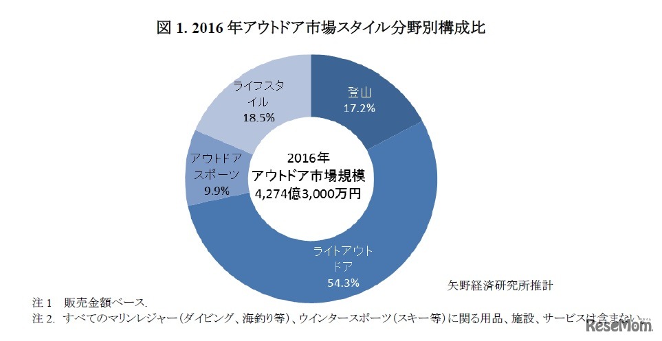 2016年の国内アウトドア市場規模は4,274億3,000万円と推計されることが、矢野経済研究所の調査より明らかになった。キャンプやハイキング、釣りなど自然環境と関わる「ライトアウトドア分野」が市場全体の半分以上を占めている。