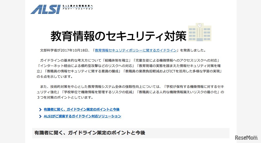 アルプスシステムインテグレーション(ALSI)は、10月18日に文部科学省による「教育情報セキュリティポリシーに関するガイドライン」が発表されたことを受け、「ガイドライン」策定のポイントと情報セキュリティ対策の今後の展望についてWebサイトに情報を掲載した。