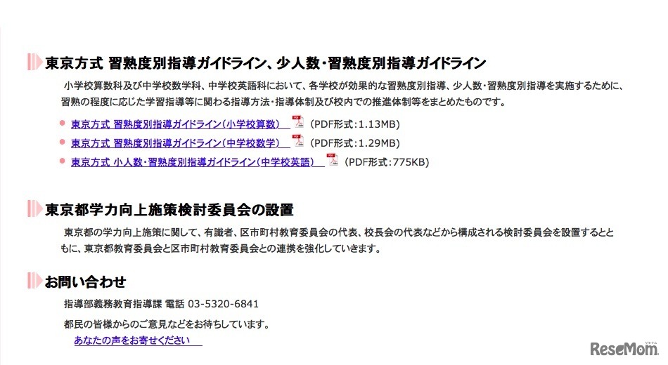 東京都教育委員会は10月18日、「東京方式 習熟度別指導ガイドライン」および「少人数・習熟度別指導ガイドライン」をWebサイトに掲載した。小学校算数、中学校数学・英語について、習熟度指導にあたっての方法や具体的な目標などをまとめている。