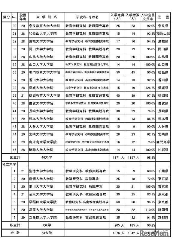 文部科学省は10月23日、平成29年度国私立教職大学院入学者選抜の実施状況を発表した。53大学院の入学定員充足率は前年度比(平成28年度比)1.9%減の97.5%。入学者数は過去10年で増加傾向にあり、平成20年度と比べて倍増している。