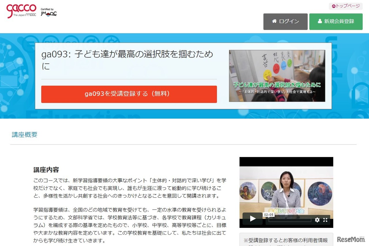 子供教育創造機構は、大規模公開オンライン講座「gacco(ガッコ)」で無料講座「子ども達が最高の選択肢を掴むために~『主体的・対話的で深い学び』を社会で実現する~」を12月19日に開講する。受講者募集は10月24日に開始した。