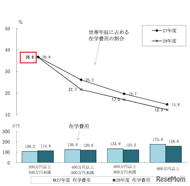 日本政策金融公庫「教育費負担の実態調査結果」(2017年1月30日発表)より 年収階層別にみた世帯年収に占める在学費用の割合