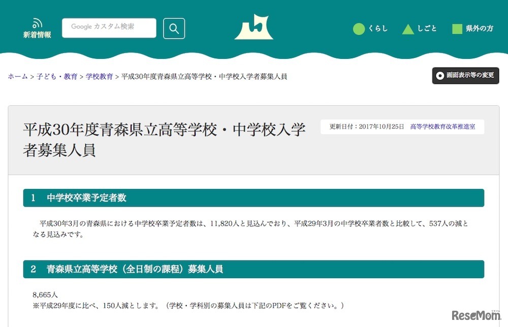 青森県教育委員会は10月25日、平成30年度(2018年度)県立高等学校・中学校入学者募集人員を発表した。中学校卒業予定者数が1万1,820人と見込まれ、県立高校(全日制)では前年度より150人減の8,665人を募集。青森県立三本木高等学校附属中学校が80人を募集する。