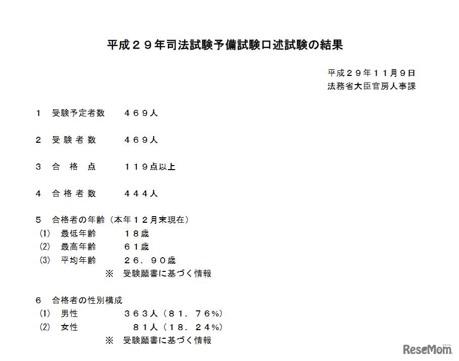 法務省は平成29年11月9日、平成29年司法試験予備試験口述試験(最終)の結果を公表した。469人が受験し、444人が合格。合格者の平均年齢は26.90歳だった。最高年齢は61歳、最低年齢は18歳。