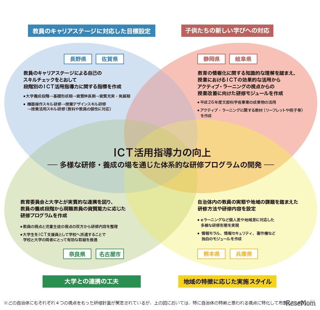 文部科学省は平成29年11月22日、ICTを活用した教育推進自治体応援事業の報告書を公表した。8地域による教員のICT活用指導力向上のための研修プログラムと25地域によるICT活用実践のモデルカリキュラムをWebサイトに掲載している。