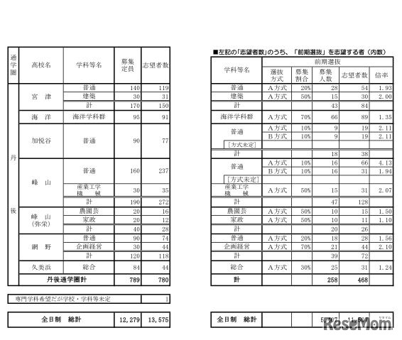 平成30年3月卒業予定の中学生の京都府公立高等学校(全日制)学校別・学科別志望状況
