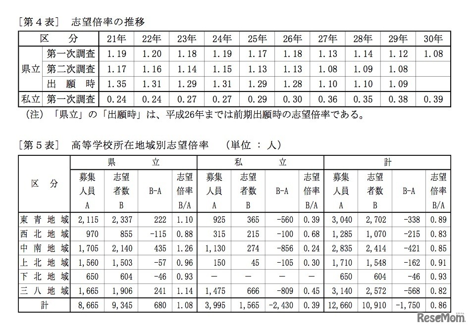 青森県教育委員会は平成29年11月30日、平成30年(2018年)3月県内中学校等卒業予定者の進路希望状況について、第1次調査の結果を公表した。11月15日現在、卒業予定者11,830人のうち99.2%が進学を希望。学校別の志望倍率は、青森1.42倍、弘前1.55倍、八戸1.35倍など。