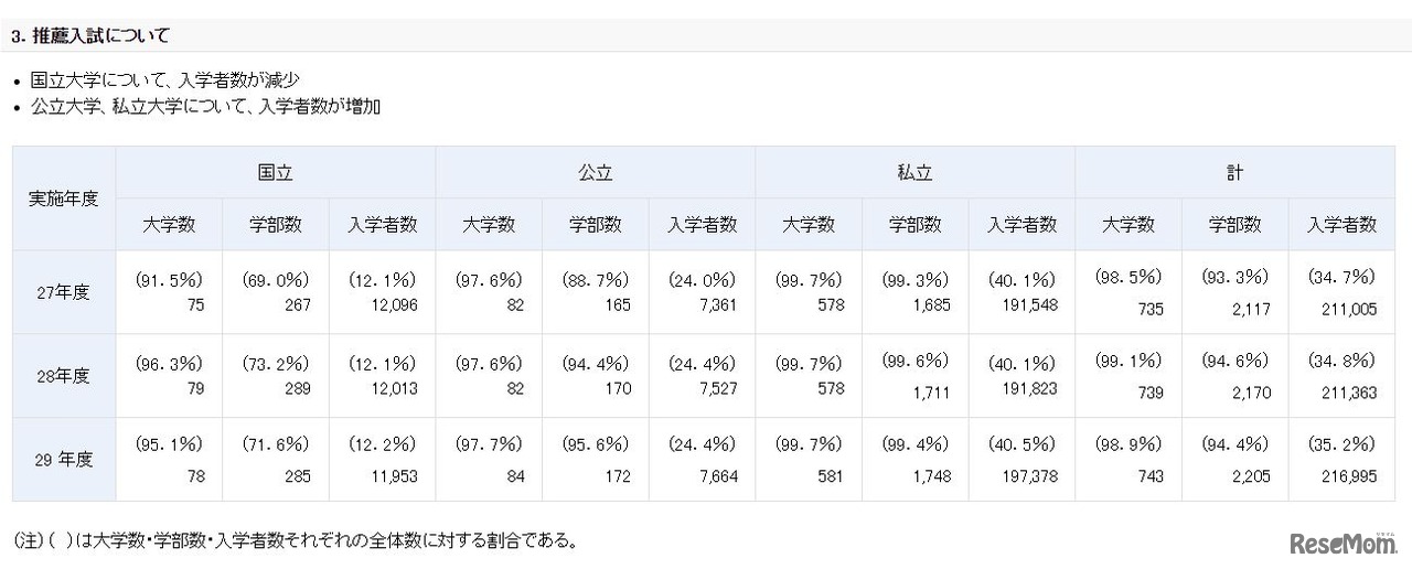 平成29年度国公私立大学入学者選抜実施状況(推薦入試)