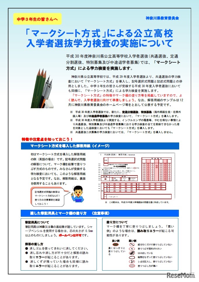 神奈川県教育委員会は平成29年12月4日、リーフレット「『マークシート方式』による公立高校入学者選抜学力検査の実施について」をWebサイトで公開した。平成29年度入学者選抜(共通選抜)のマークシート解答用紙も掲載されている。