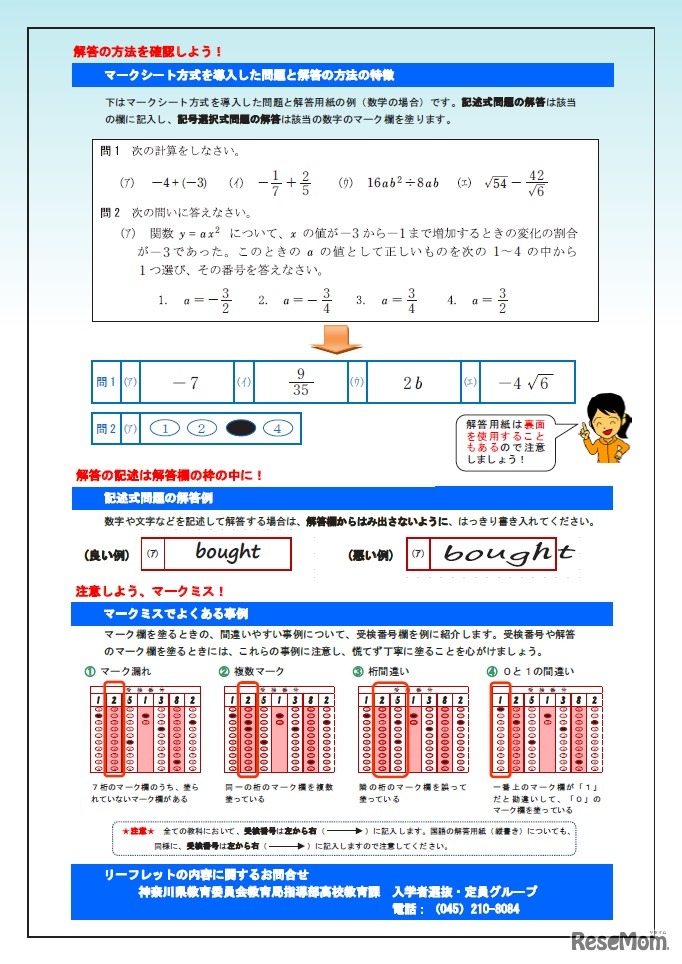 神奈川県教育委員会は平成29年12月4日、リーフレット「『マークシート方式』による公立高校入学者選抜学力検査の実施について」をWebサイトで公開した。平成29年度入学者選抜(共通選抜)のマークシート解答用紙も掲載されている。