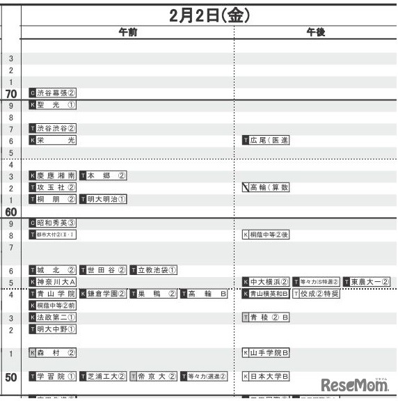 日能研「予想R4偏差値一覧」首都圏11月21日版・男子2月2日