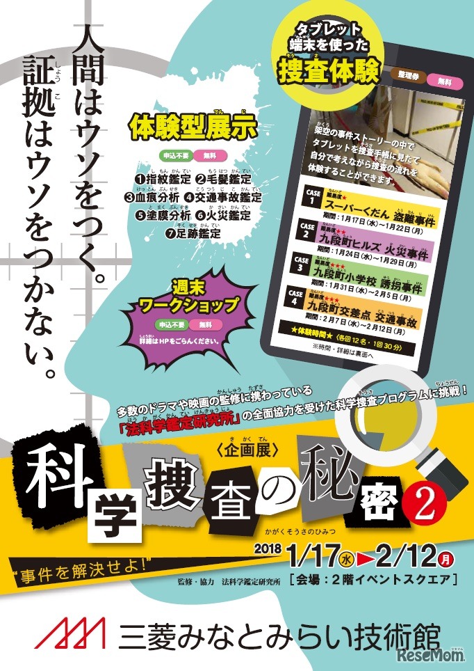 三菱みなとみらい技術館は2018年1月17日~2月12日、企画展「科学捜査の秘密2 ―証拠はウソをつかない―」を開催する。週替わりで4つの事件の捜査を体験できるコーナーのほか、週末にはワークショップも行われる。
