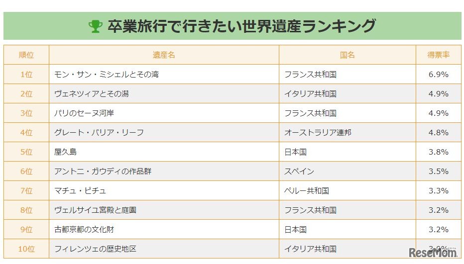 フランスの「モン・サン・ミシェルとその湾」が卒業旅行で行きたい世界遺産ランキング1位に輝いたことが、世界遺産検定を主催する世界遺産アカデミーの調査結果より明らかになった。調査結果から「インスタ映え」を重視する傾向がみられた。