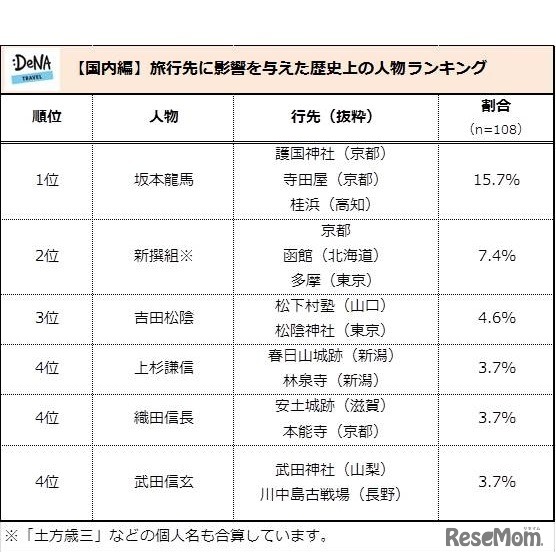 画像出典:DeNAトラベル「歴史上の人物を訪ねる旅」に関する調査 (歴史上の人物がきっかけで旅行に行ったことがある人)実際に誰に影響を受け、どこに行ったか・国内編