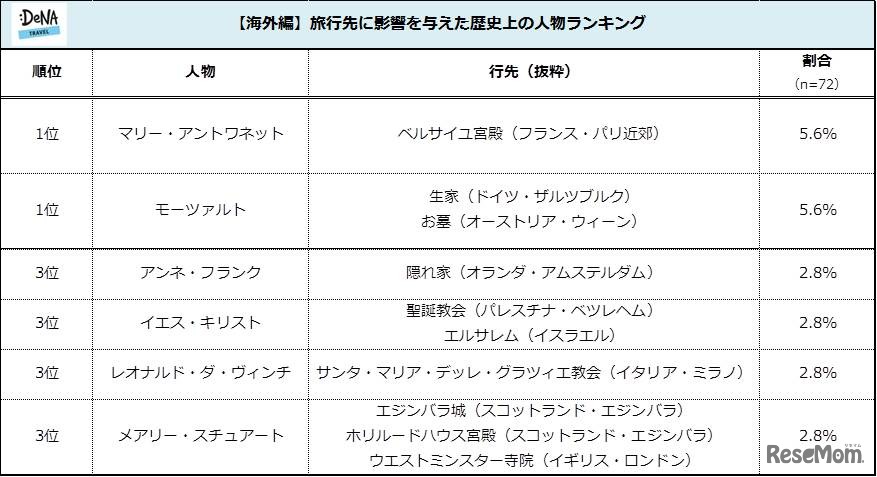 歴史上の人物がきっかけで旅行に行った経験がある人は約6割にのぼることが、DeNAトラベルの調査より明らかになった。国内の1位は2位に圧倒的大差をつけた「坂本龍馬」、海外は「マリー・アントワネット」と「モーツァルト」が同率1位であった。