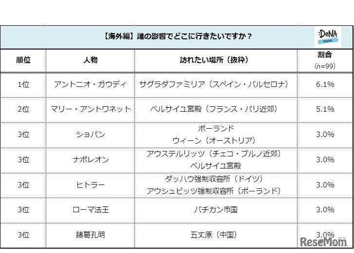 画像出典:DeNAトラベル「歴史上の人物を訪ねる旅」に関する調査 (歴史上の人物の影響で行きたいと思っている場所が「ある」人)誰の影響で旅行に行きたいか・海外編