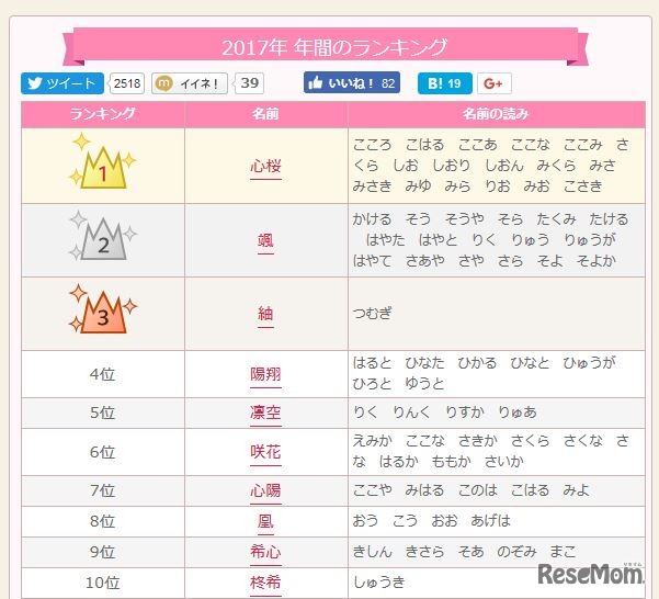 スマートフォン向けアプリ「赤ちゃん名づけ」を提供するリクスタは2017年12月6日、「2017年赤ちゃん名づけ総合年間トレンド」を発表した。1位に「心桜」、2位に「颯」、3位に「紬」が選ばれた。