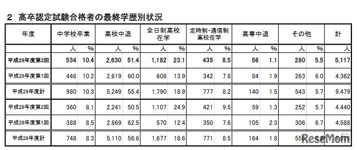 平成29年度第2回高等学校卒業程度認定試験 高卒認定試験合格者の最終学歴別状況