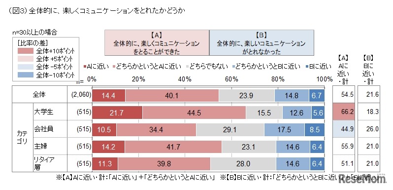対面や電話で話したり、知り合いや友人の数が増えると、コミュニケーションが楽しくなることが、JTBコミュニケーションデザインの調査からわかった。2017年のコミュニケーションについて、半数以上が「楽しくとることができた」と答え、特に大学生は高い割合を示した。