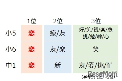 小中学生が選ぶ2017年の漢字は、1位「恋」、2位「友」となったことが、ニフティが運営する子ども向けWebサイト「キッズ@nifty」が実施したアンケートにより明らかになった。「恋」は2位と倍以上の差をつけて多くの票が集まった。