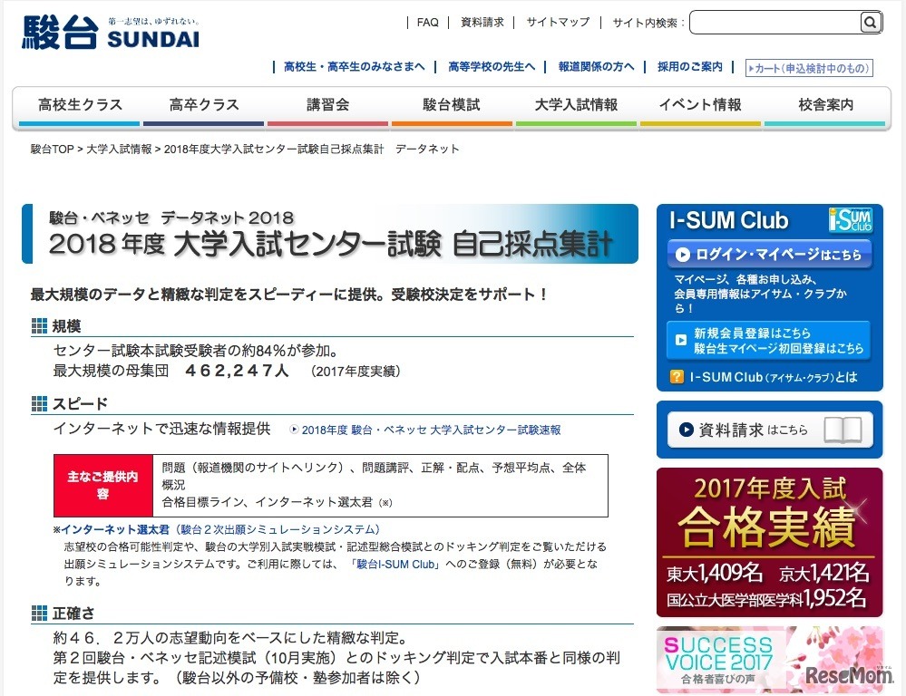 【大学受験2018】駿台、データネット2018の案内掲載…集計カードは12月下旬配布 3枚目の写真・画像
