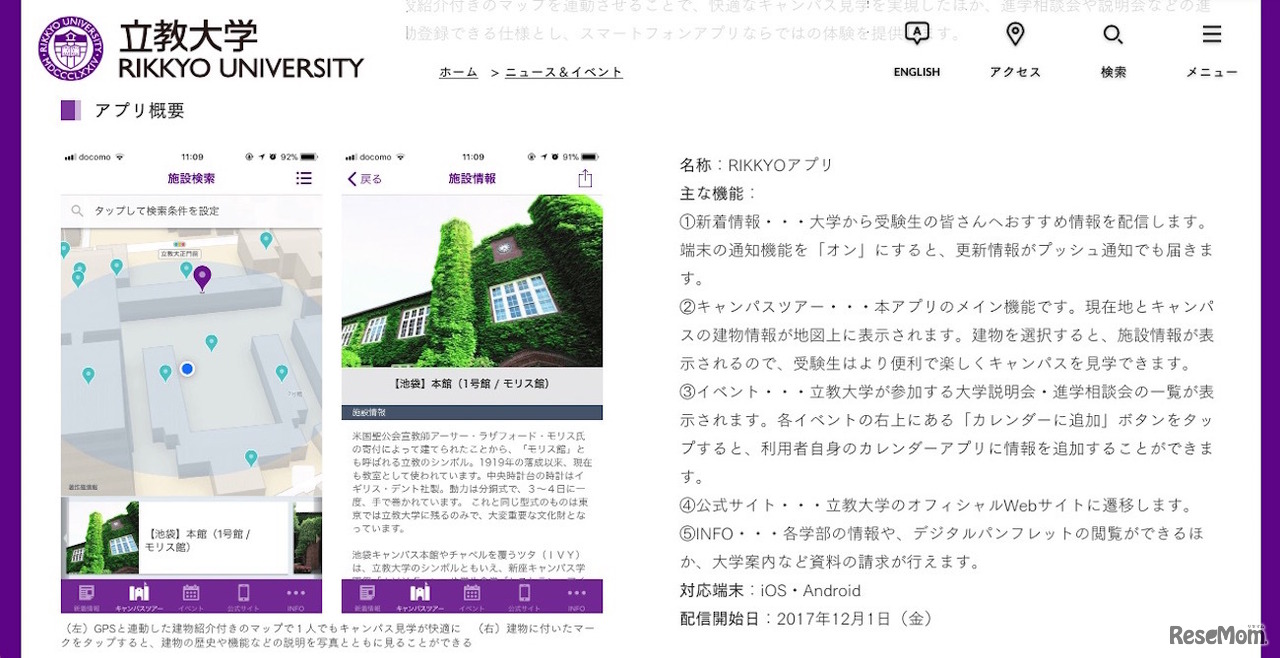 立教大学は、受験生向けの情報配信アプリ「RIKKYOアプリ」を開発、2017年12月1日より提供を開始した。快適なキャンパス見学をサポートする「キャンパスツアー」機能やイベント情報、受験に関する情報などをタイムリーに提供する。iOS、Androidともに対応。
