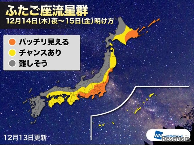 ふたご座流星群が2017年12月14日午後3時頃にピークを迎える。見頃は12月13日と14日の2夜。特に放射点が空高く上がってくる午後9時以降の観測がおすすめ。関東や東海など太平洋側は雲がなく、流星を見られるチャンスがありそう。