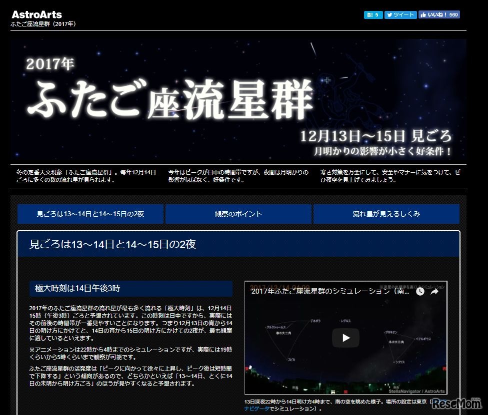ふたご座流星群が2017年12月14日午後3時頃にピークを迎える。見頃は12月13日と14日の2夜。特に放射点が空高く上がってくる午後9時以降の観測がおすすめ。関東や東海など太平洋側は雲がなく、流星を見られるチャンスがありそう。