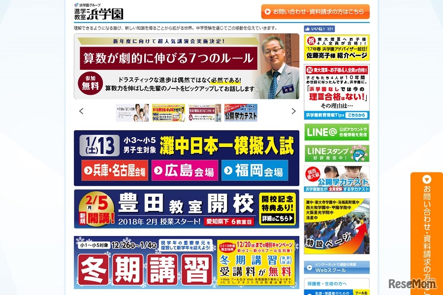 浜学園は灘中の入試日である2018年1月13日、小学3年生~5年生を対象とした「灘中日本一模擬入試」を兵庫・大阪・京都・奈良・愛知・広島・福岡の各会場で開催する。答案返却後、各教科のWeb全問解説も付いている。参加者全員に灘中合格グッズがプレゼントされる。