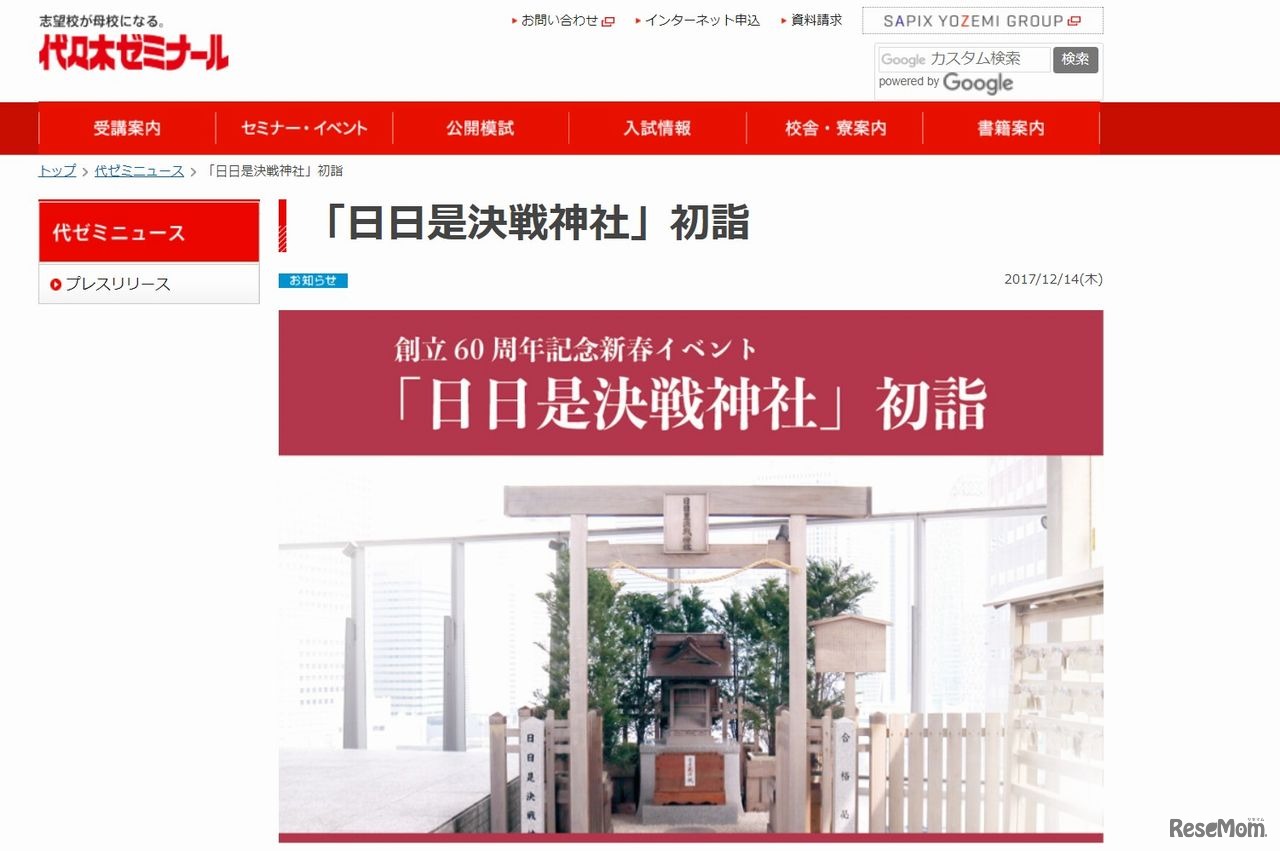 代々木ゼミナールは2018年1月1日、本部校である代ゼミタワー16階の「合格必至 日日是決戦神社」にて、創立60周年記念新春イベントを実施する。誰でも参拝が可能なほか、護符の配布や代ゼミ講師による新春特別公演を実施する。