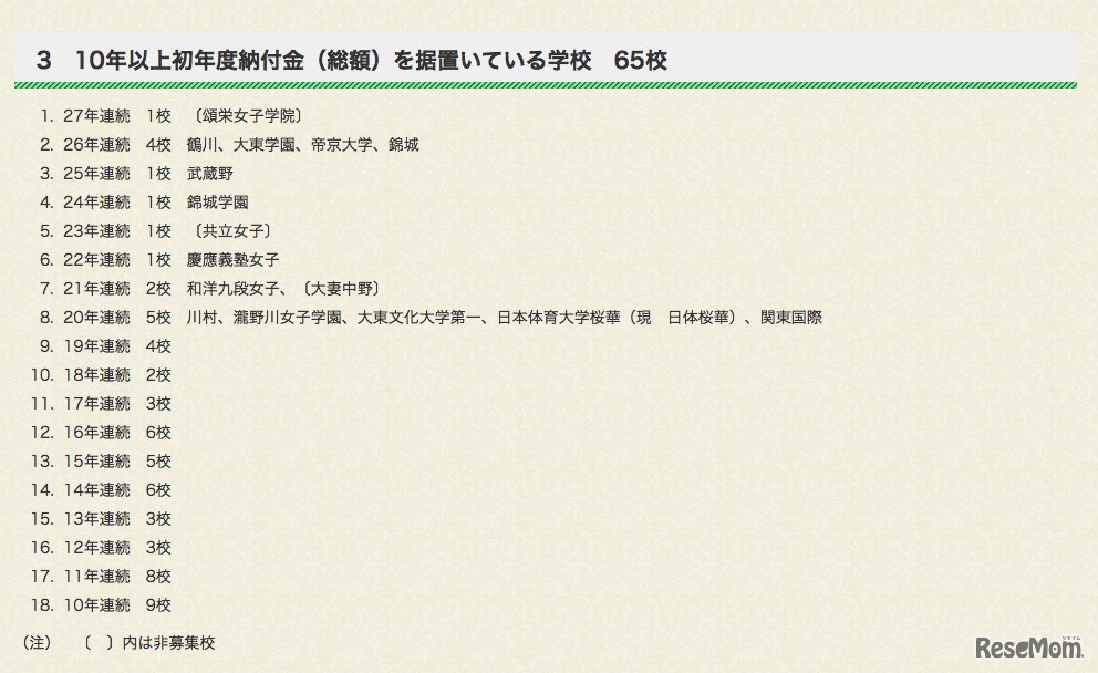 画像出典:東京都 平成30年度 都内私立高等学校(全日制)の学費の状況(平成29年12月14日報道発表資料) 平成30年度 都内私立高校(全日制)の初年度納付金 10年以上「据置き」している学校