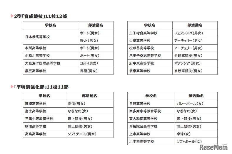 画像出典:東京都教育委員会 「スポーツ特別強化校」一覧 2型「育成競技」11校12部と「準特別強化部」11校11部