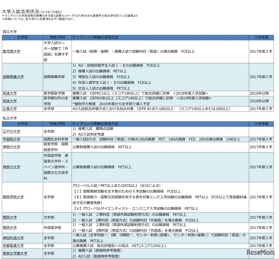 ケンブリッジ英語検定 大学入試での活用状況(2017年7月時点)