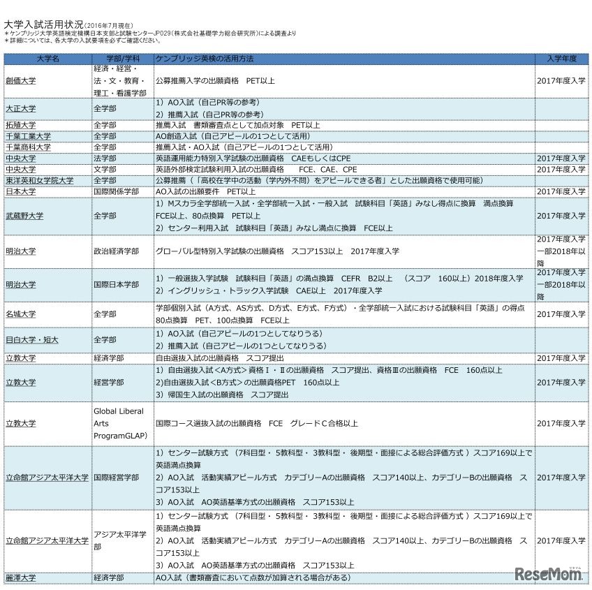 ケンブリッジ英語検定 大学入試での活用状況(2017年7月時点)