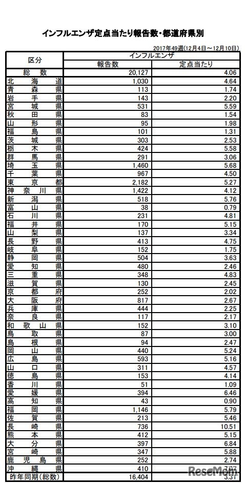 厚生労働省は、2017年12月4日から12月10日までのインフルエンザ発生状況を発表した。定点あたり報告数は4.06で、長崎県が10.51ともっとも多い。全国の医療機関をこの1週間に受診した患者数は約20万人と推計される。