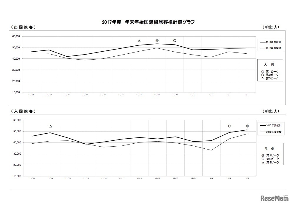 画像出典:成田国際空港 2017年12月15日発表「2017年度 年末年始国際線旅客推計」 2017年度 年末年始国際線旅客推計値グラフ