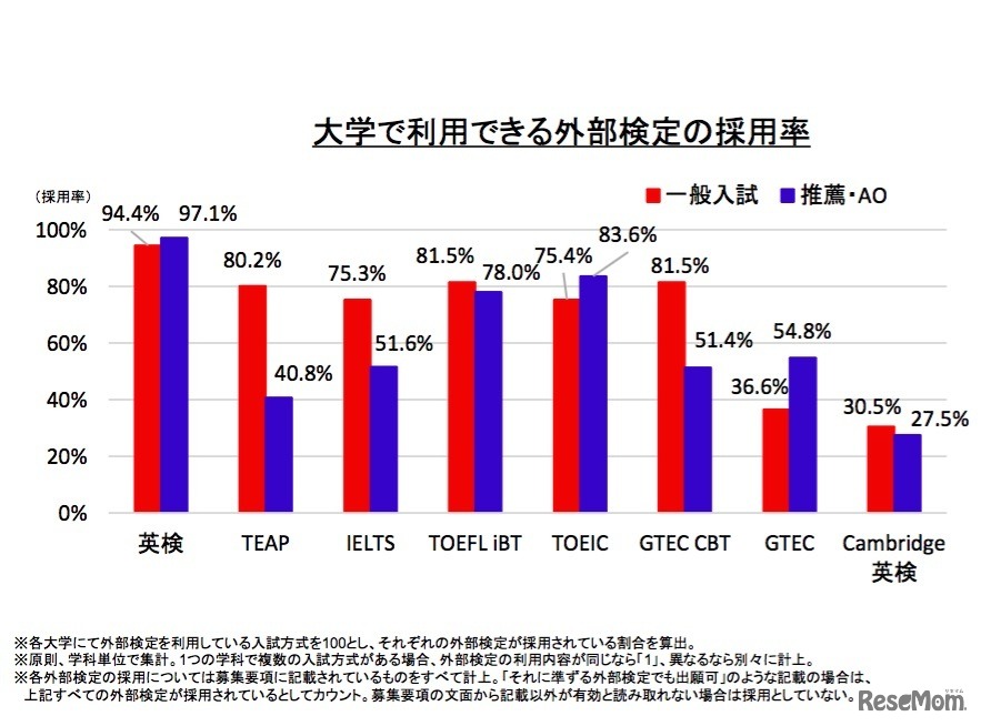 旺文社の教育情報センターは2017年12月18日、2018年度大学入試(一般入試、推薦・AO入試)における英語の外部検定利用に関する調査結果を報告。全大学の入試要項の分析を行ったところ、採用率は「英検」が高く、レベルは「準2級~2級」を基準としている大学が多かった。