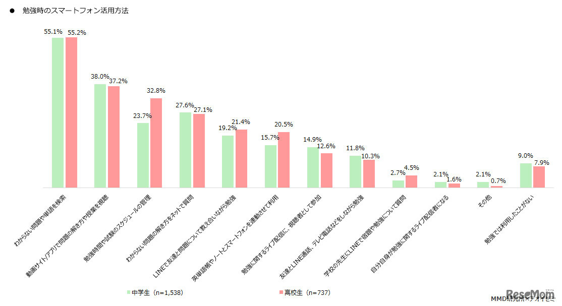 中高生の9割以上が勉強でスマートフォンを使用し、中学生の14.5%、高校生の86.5%が学校へのスマートフォン持込みが許可されていることが、MMD研究所とアオイゼミの共同調査より明らかになった。