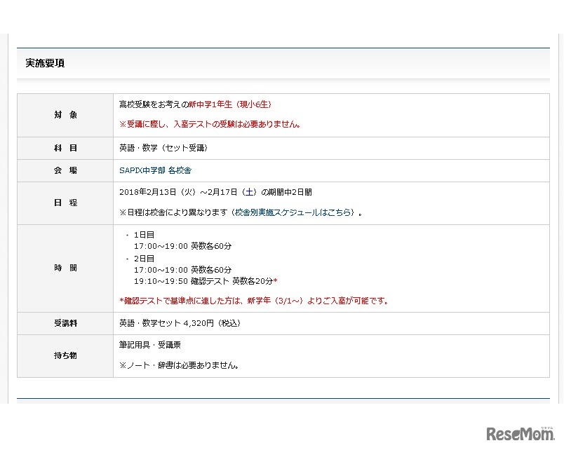 SAPIX中学部は、2018年2月13日~17日の期間中で2日間受講する「新中1中学進学英数ゼミ」を東京、神奈川、埼玉、千葉、兵庫の各校舎で開催する。対象は、高校受験を考える新中学1年生(現小学校6年生)。受講料は英語・算数のセットで4,320円(税込)。