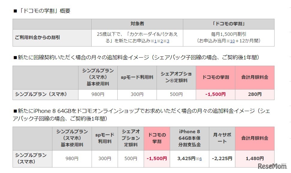 NTTドコモは2017年12月19日、25歳以下を対象とした「ドコモの学割」を12月27日より実施すると発表した。「カケホーダイ&パケあえる」の基本プランなどを新たに申し込むことで、毎月の利用料金から1,500円を1年間割引する 。